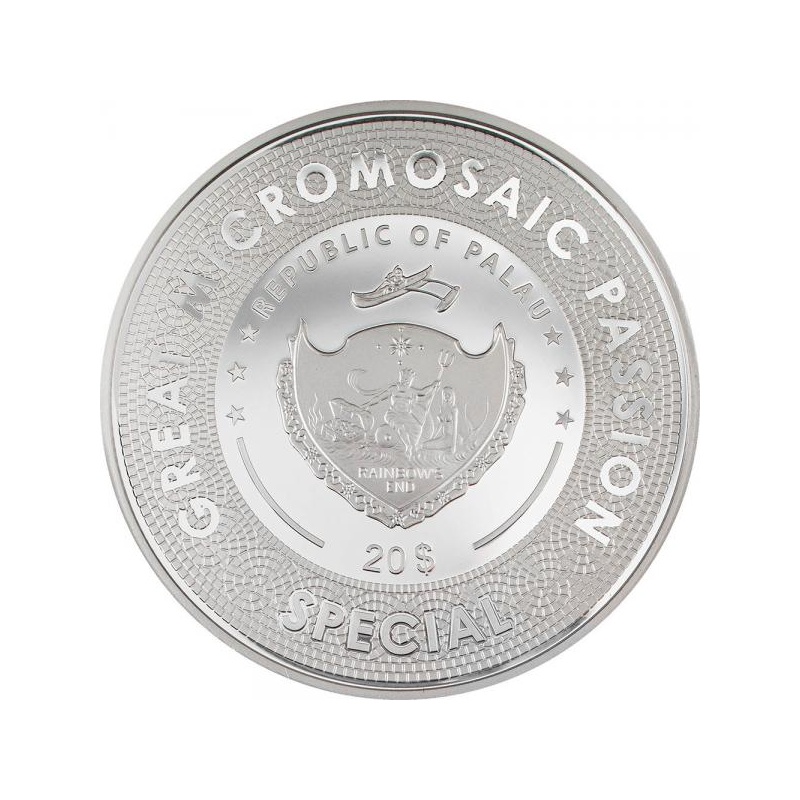 Эта серебряная монета, весом в 3 унции, является пятой в инновационной серии «Великая страсть к микромозаике», посвященной мозаичному искусству и самой известной картине Тамары Де Лемпицкой — «Девушка в зеленом». Монета состоит из более чем 8000 плиток, отчеканенных благодаря технологии Smartminting, и поставляется в футляре в форме мозаичной плитки вместе с сертификатом подлинности. Тираж всего 499 штук по всему миру!