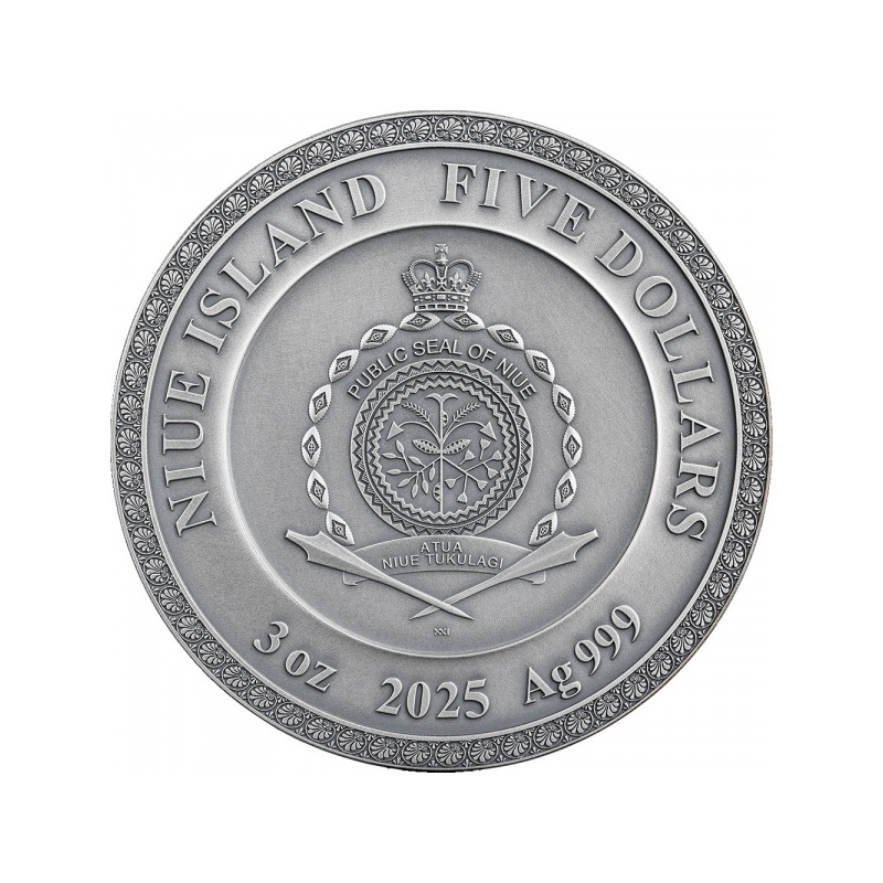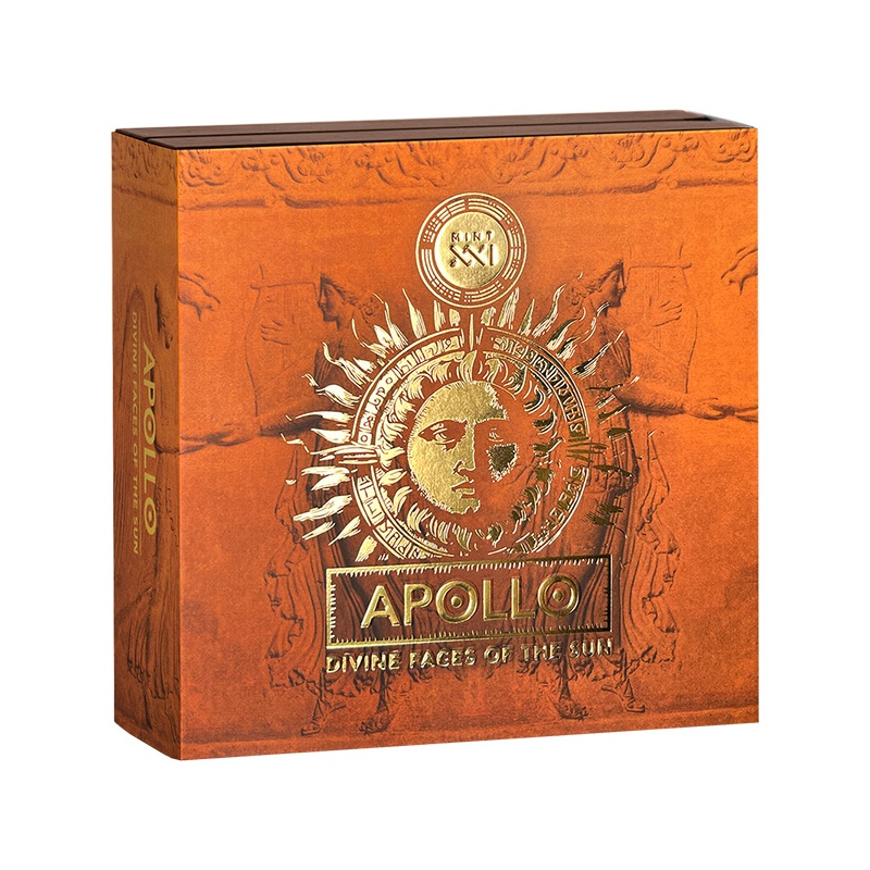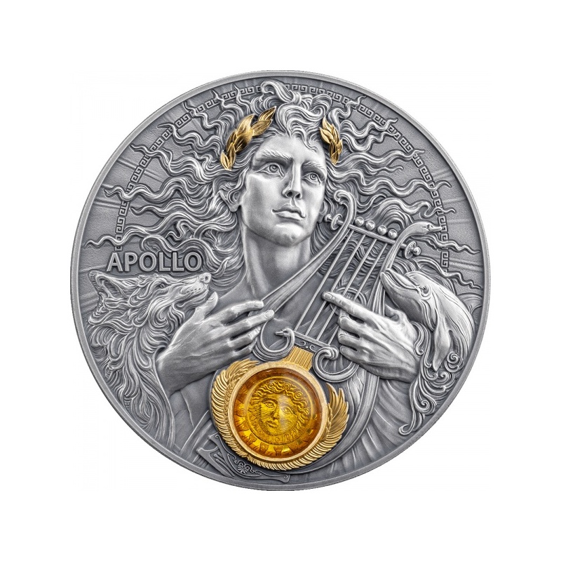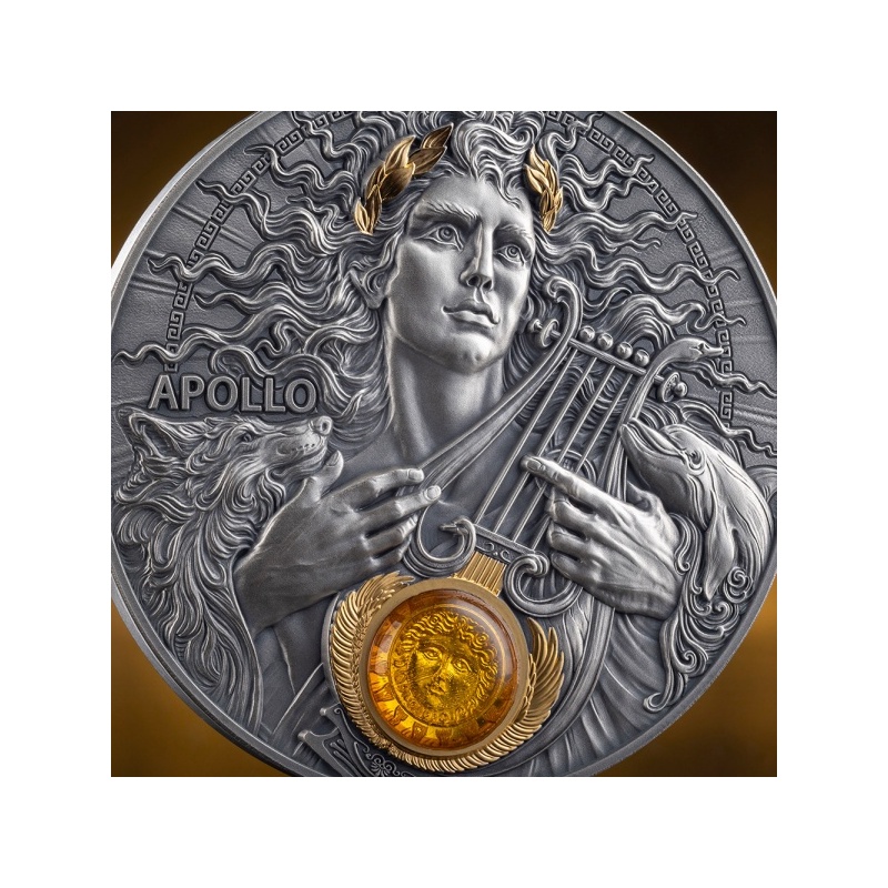 На этой серебряной монете, премиум-класса, весом в 3 унции, благородный лик Аполлона предстаёт в потрясающем высоком рельефе, его струящиеся волосы увенчаны лавровым венком — символом вечной славы. Теплая янтарная вставка сияет, словно сердце солнца, а позолота подчёркивает его небесную силу.