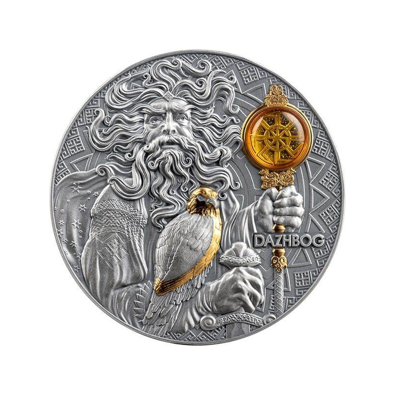 Дажьбог- бог солнца. Острова Ниуэ, 5 $, 2024 г., 99,9% серебряная монета с позолотой, с антик обработкой и вставкой из янтаря 93,3 г.