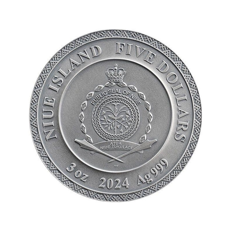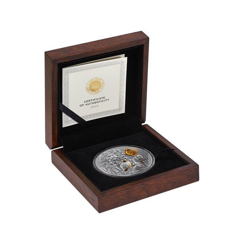 На этой серебряной монете, премиум-класса, весом в 3 унции, благородный лик Аполлона предстаёт в потрясающем высоком рельефе, его струящиеся волосы увенчаны лавровым венком — символом вечной славы. Теплая янтарная вставка сияет, словно сердце солнца, а позолота подчёркивает его небесную силу.
