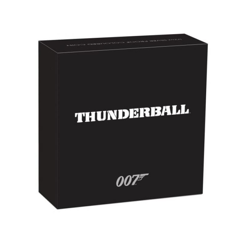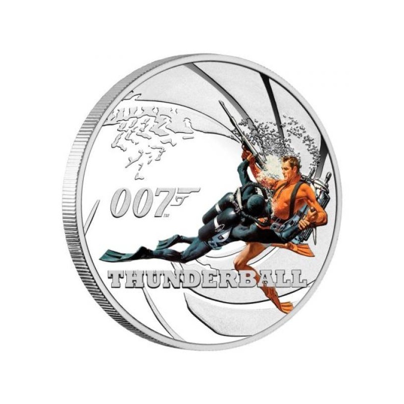 На реверсе монеты - цветное изображение Джеймса Бонда во время подводного боя. Судя по официальной афише, он сражается с аквалангистом с ножом. На реверсе находится изображение легендарного ствола пистолета из фирменной последовательности открытия франшизы, знаменитый логотип пистолета 007 и надпись «THUNDERBALL».