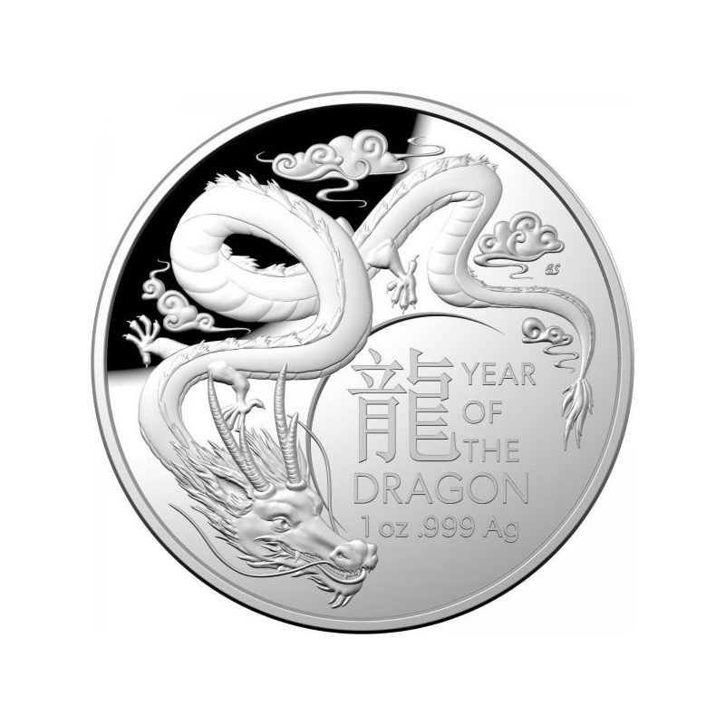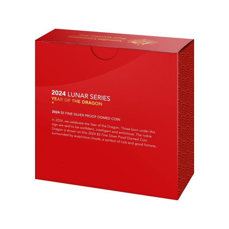 "Год Дракона - 2024 г.- Лунный Календарь." - Австралия, 5 $, 2024 г., 99,99% серебряная монета форме купола, 31.107 г.