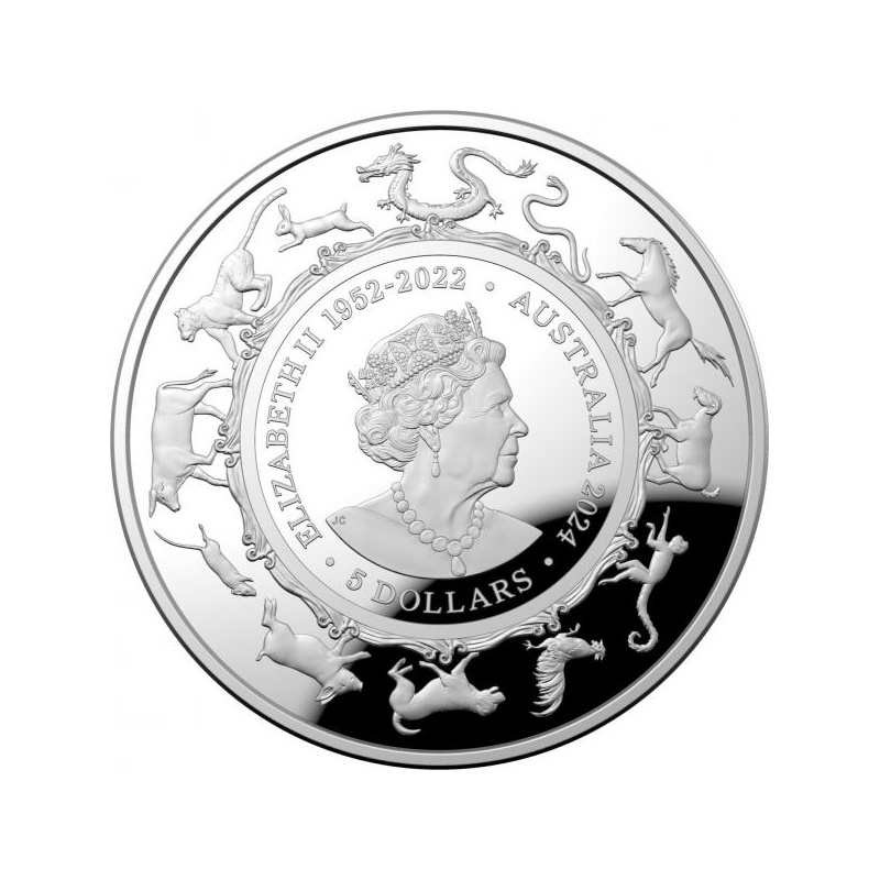 В центре монеты, в окружении традиционных китайских мотивов, изображен дракон. Он заходит в монету через дверь, изображенную на реверсе. Мифическое существо изображено в традиционном образе дракона в китайской иконографии. Идеограмма дракона распологается справа. Дата 2024г. и надпись :«Год Дракона» находятся вверху во внешнем круге. На реверсе изображены все животные китайского зодиакального круга. Все они показаны на экране, окружающем дверь традиционного китайского храма. Полный цикл китайского зодиака будет составлен с 2018 по 2029 год.