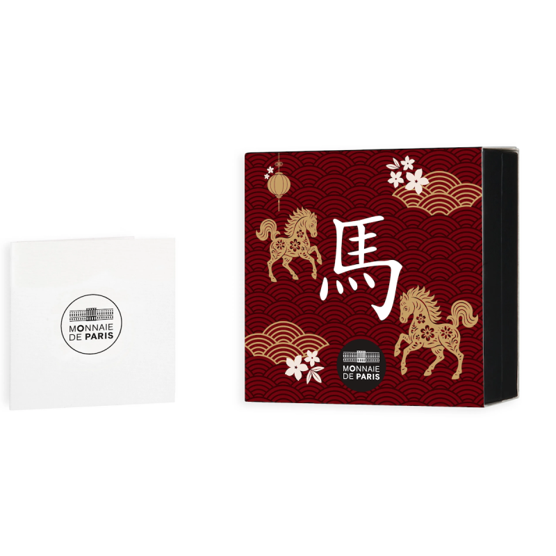 В центре аверса монеты изображена скачущая лошадь. Она словно пересекает кольцо, украшенное традиционными китайскими мотивами. Движущаяся лошадь символизирует характерные черты представителей этого знака: энергию, независимость и страсть. На контурах рисунка указан год 2026 и надпись «Год Лошади». На реверсе монеты изображены все животные китайского зодиака на ширме, окружающей традиционную дверь храма. Полный цикл китайского зодиака начинается в 2018 году и продолжается до 2029 года. Каждый из двенадцати лет этого периода представлен одним из животных зодиака. Номинал указан в левом верхнем углу, а на двери — символ «RF».