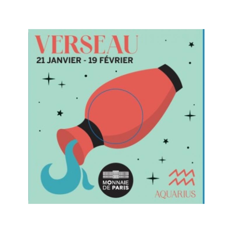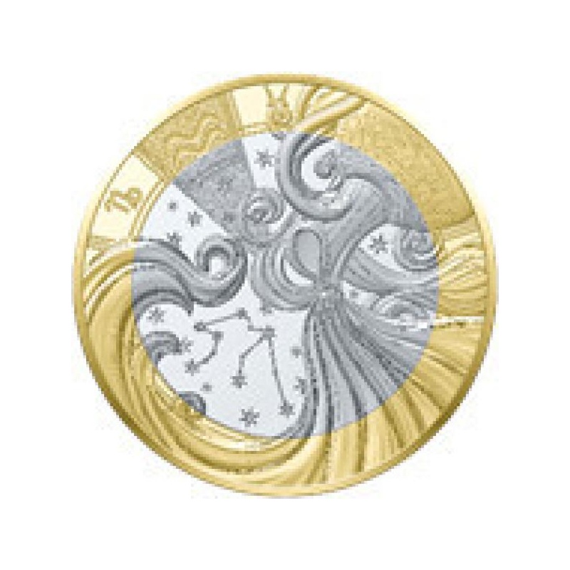 На золотом крае монеты выгравирован зодиакальный круг. Один знак выделяется на фоне, потому что он больше остальных и имеет пескоструйный фон, отличающийся от более гладкого у остальных.Это символ знака зодиака Водолей. Часть колеса скрыта спиралями тумана, что соответствует воздуху, стихии этого знака. Другая часть колеса погружена в воду, льющуюся из носика богато украшенной вазы. На заднем плане видно звездное небо с созвездием Водолея.